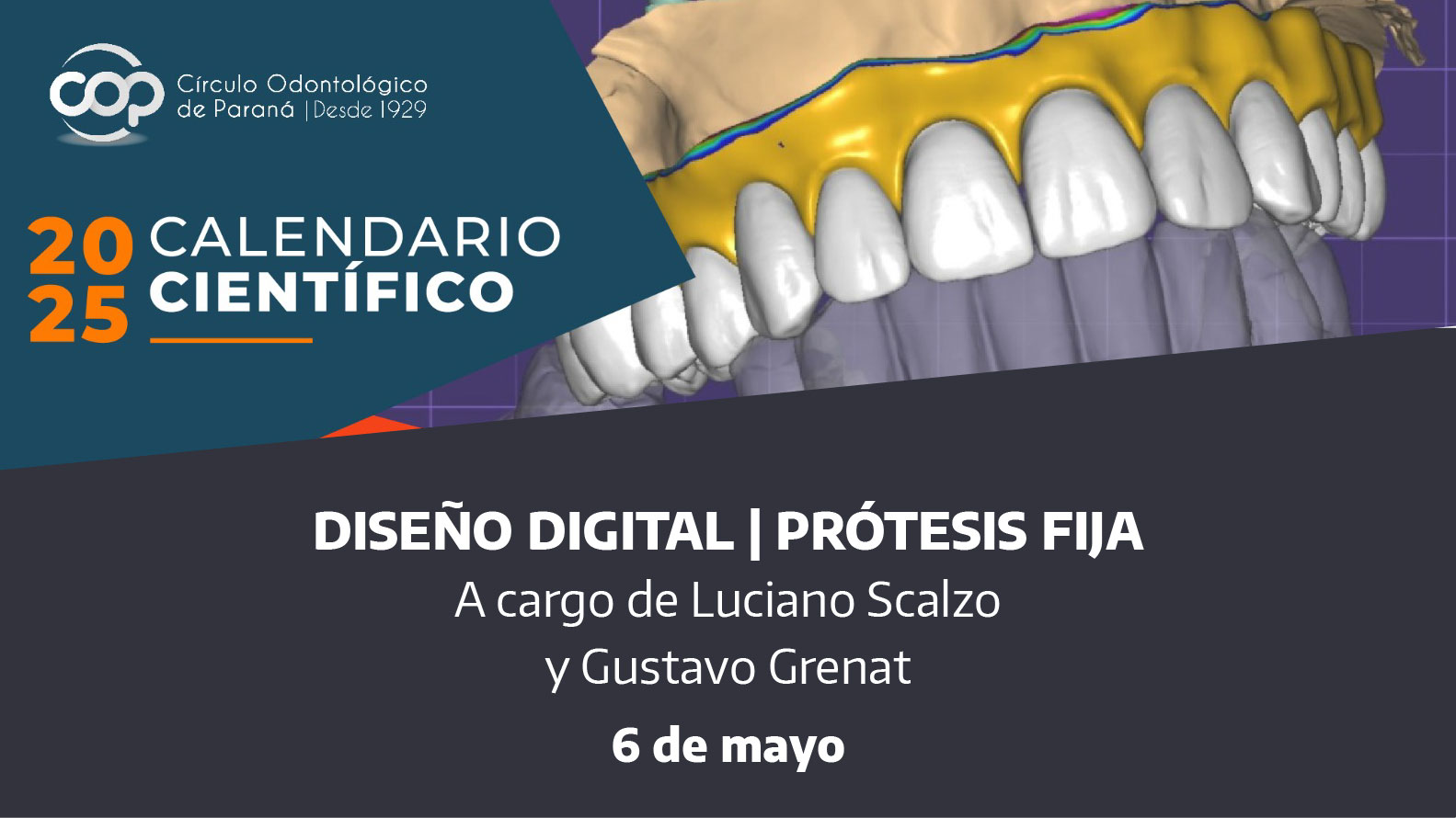 El próximo 6 de mayo se realizará una jornada de formación intensiva, a cargo de los especialistas Luciano Scalzo -formador dental Cad Desing, Demostrador CadCam- y Gustavo Grenat -Profesor titular de Cirugía I1 UAP. Fellowship in oral implantolo-gy. University of Pittsburght, experto en cirugía y traumatología maxilofacial-